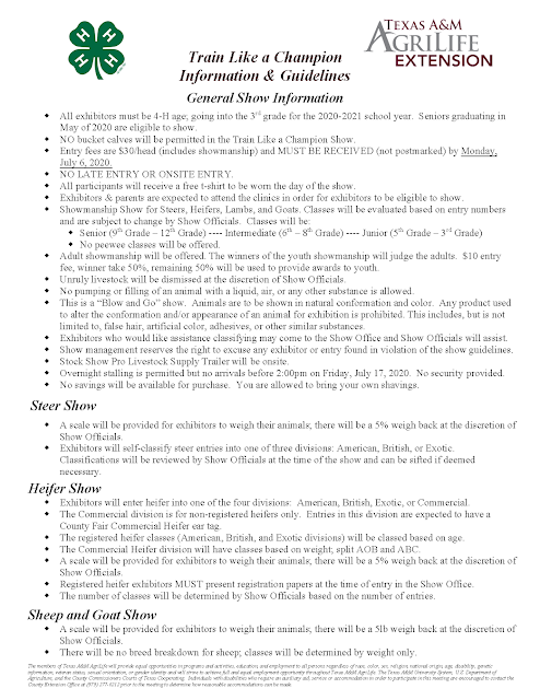 They are still offering the showmanship clinic/workout, showmanship contest, and the prospect show. There is a fee of $30 per head and this includes showmanship (only allowed to show 1 species in the showmanship contest). Deadline to enter is July 6 and NO ONSITE OR LATE ENTRIES WILL BE ACCEPTED.